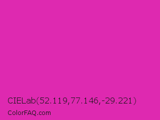 CIELab 52.119,77.146,-29.221 Color is a normal magenta color and the nearest color is Frostbite #e936a7. Hex code #de29b0 and RGB value is rgb(222,41,176). In RGB color space, this color is composed of 87% red, 16% green, 69% blue, In CMYK color space, this color is composed of 0% cyan, 82% magenta, 21% yellow , 13% black , In HSL color space, this color has a hue angle of 315° , 73% saturation and 52% lightness.