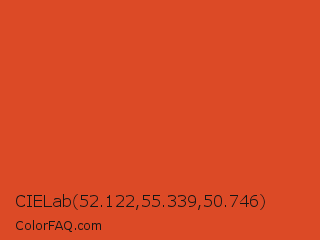 CIELab 52.122,55.339,50.746 Color is a normal red color and the nearest color is Punch #dc4333. Hex code #dc4a26 and RGB value is rgb(220,74,38). In RGB color space, this color is composed of 86% red, 29% green, 15% blue, In CMYK color space, this color is composed of 0% cyan, 66% magenta, 83% yellow , 14% black , In HSL color space, this color has a hue angle of 12° , 72% saturation and 51% lightness.