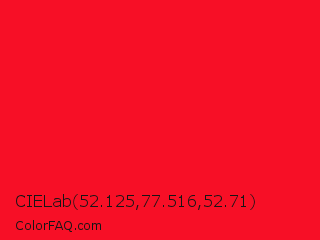 CIELab 52.125,77.516,52.71 Color is a normal red color and the nearest color is Vivid Red #f70d1a. Hex code #f70f26 and RGB value is rgb(247,15,38). In RGB color space, this color is composed of 97% red, 6% green, 15% blue, In CMYK color space, this color is composed of 0% cyan, 94% magenta, 85% yellow , 3% black , In HSL color space, this color has a hue angle of 354° , 94% saturation and 51% lightness.