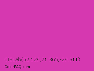 CIELab 52.129,71.365,-29.311 Color is a normal magenta color and the nearest color is Frostbite #e936a7. Hex code #d638b0 and RGB value is rgb(214,56,176). In RGB color space, this color is composed of 84% red, 22% green, 69% blue, In CMYK color space, this color is composed of 0% cyan, 74% magenta, 18% yellow , 16% black , In HSL color space, this color has a hue angle of 314° , 66% saturation and 53% lightness.
