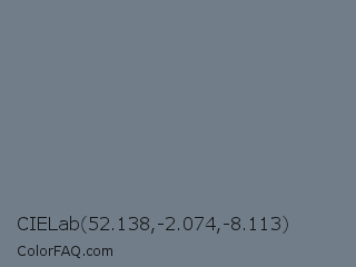 CIELab 52.138,-2.074,-8.113 Color is a normal blue color and the nearest color is Raven #727b89. Hex code #717e8a and RGB value is rgb(113,126,138). In RGB color space, this color is composed of 44% red, 49% green, 54% blue, In CMYK color space, this color is composed of 18% cyan, 9% magenta, 0% yellow , 46% black , In HSL color space, this color has a hue angle of 209° , 10% saturation and 49% lightness.