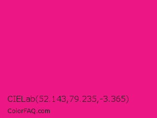 CIELab 52.143,79.235,-3.365 Color is a normal rose color and the nearest color is Barbie Pink #e0218a. Hex code #ed1685 and RGB value is rgb(237,22,133). In RGB color space, this color is composed of 93% red, 9% green, 52% blue, In CMYK color space, this color is composed of 0% cyan, 91% magenta, 44% yellow , 7% black , In HSL color space, this color has a hue angle of 329° , 86% saturation and 51% lightness.