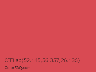 CIELab 52.145,56.357,26.136 Color is a normal red color and the nearest color is English Vermillion #cc474b. Hex code #d94a53 and RGB value is rgb(217,74,83). In RGB color space, this color is composed of 85% red, 29% green, 33% blue, In CMYK color space, this color is composed of 0% cyan, 66% magenta, 62% yellow , 15% black , In HSL color space, this color has a hue angle of 356° , 65% saturation and 57% lightness.