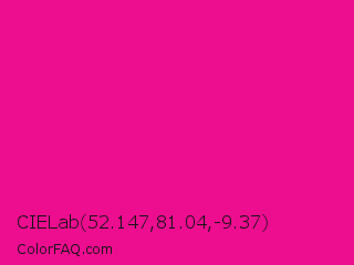 CIELab 52.147,81.04,-9.37 Color is a normal magenta color and the nearest color is Fluorescent Pink #ff1493. Hex code #ed0d8f and RGB value is rgb(237,13,143). In RGB color space, this color is composed of 93% red, 5% green, 56% blue, In CMYK color space, this color is composed of 0% cyan, 95% magenta, 40% yellow , 7% black , In HSL color space, this color has a hue angle of 325° , 90% saturation and 49% lightness.