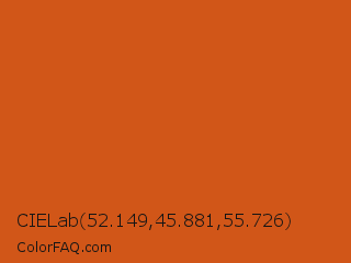 CIELab 52.149,45.881,55.726 Color is a normal orange color and the nearest color is Orange Roughy #c45719. Hex code #d15618 and RGB value is rgb(209,86,24). In RGB color space, this color is composed of 82% red, 34% green, 9% blue, In CMYK color space, this color is composed of 0% cyan, 59% magenta, 89% yellow , 18% black , In HSL color space, this color has a hue angle of 20° , 79% saturation and 46% lightness.