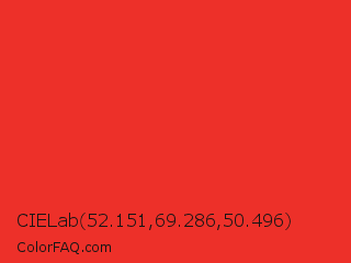 CIELab 52.151,69.286,50.496 Color is a normal red color and the nearest color is Permanent Geranium Lake #e12c2c. Hex code #ed3029 and RGB value is rgb(237,48,41). In RGB color space, this color is composed of 93% red, 19% green, 16% blue, In CMYK color space, this color is composed of 0% cyan, 80% magenta, 83% yellow , 7% black , In HSL color space, this color has a hue angle of 2° , 84% saturation and 55% lightness.