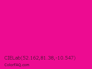 CIELab 52.162,81.38,-10.547 Color is a normal magenta color and the nearest color is Fluorescent Pink #ff1493. Hex code #ed0b91 and RGB value is rgb(237,11,145). In RGB color space, this color is composed of 93% red, 4% green, 57% blue, In CMYK color space, this color is composed of 0% cyan, 95% magenta, 39% yellow , 7% black , In HSL color space, this color has a hue angle of 324° , 91% saturation and 49% lightness.