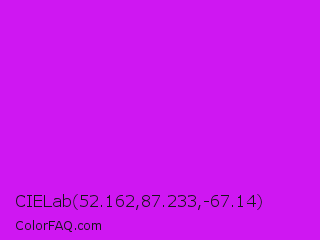 CIELab 52.162,87.233,-67.14 Color is a normal purple color and the nearest color is Vivid Orchid #cc00ff. Hex code #cf17f2 and RGB value is rgb(207,23,242). In RGB color space, this color is composed of 81% red, 9% green, 95% blue, In CMYK color space, this color is composed of 14% cyan, 90% magenta, 0% yellow , 5% black , In HSL color space, this color has a hue angle of 290° , 89% saturation and 52% lightness.
