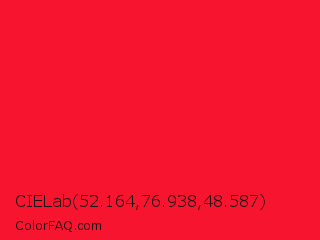 CIELab 52.164,76.938,48.587 Color is a normal red color and the nearest color is Torch Red #fd0e35. Hex code #f6142e and RGB value is rgb(246,20,46). In RGB color space, this color is composed of 96% red, 8% green, 18% blue, In CMYK color space, this color is composed of 0% cyan, 92% magenta, 81% yellow , 4% black , In HSL color space, this color has a hue angle of 353° , 93% saturation and 52% lightness.