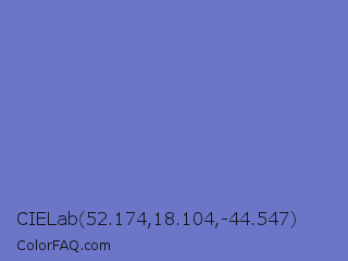 CIELab 52.174,18.104,-44.547 Color is a normal blue color and the nearest color is Toolbox #746cc0. Hex code #6b76c9 and RGB value is rgb(107,118,201). In RGB color space, this color is composed of 42% red, 46% green, 79% blue, In CMYK color space, this color is composed of 47% cyan, 41% magenta, 0% yellow , 21% black , In HSL color space, this color has a hue angle of 233° , 47% saturation and 60% lightness.