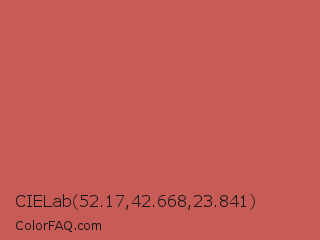CIELab 52.17,42.668,23.841 Color is a normal red color and the nearest color is Fuzzy Wuzzy Brown #c45655. Hex code #c75b56 and RGB value is rgb(199,91,86). In RGB color space, this color is composed of 78% red, 36% green, 34% blue, In CMYK color space, this color is composed of 0% cyan, 54% magenta, 57% yellow , 22% black , In HSL color space, this color has a hue angle of 3° , 50% saturation and 56% lightness.