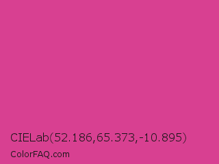 CIELab 52.186,65.373,-10.895 Color is a normal rose color and the nearest color is Pink Pantone #d74894. Hex code #d84091 and RGB value is rgb(216,64,145). In RGB color space, this color is composed of 85% red, 25% green, 57% blue, In CMYK color space, this color is composed of 0% cyan, 70% magenta, 33% yellow , 15% black , In HSL color space, this color has a hue angle of 328° , 66% saturation and 55% lightness.