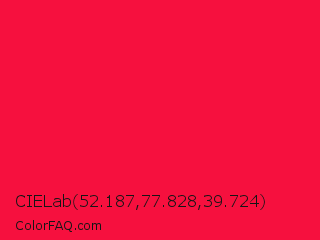 CIELab 52.187,77.828,39.724 Color is a normal red color and the nearest color is Red Ribbon #ed0a3f. Hex code #f6103e and RGB value is rgb(246,16,62). In RGB color space, this color is composed of 96% red, 6% green, 24% blue, In CMYK color space, this color is composed of 0% cyan, 93% magenta, 75% yellow , 4% black , In HSL color space, this color has a hue angle of 348° , 93% saturation and 51% lightness.