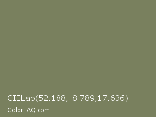 CIELab 52.188,-8.789,17.636 Color is a normal lime color and the nearest color is Flax Smoke #7b8265. Hex code #79805e and RGB value is rgb(121,128,94). In RGB color space, this color is composed of 47% red, 50% green, 37% blue, In CMYK color space, this color is composed of 5% cyan, 0% magenta, 27% yellow , 50% black , In HSL color space, this color has a hue angle of 72° , 15% saturation and 44% lightness.