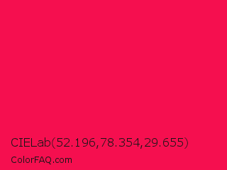 CIELab 52.196,78.354,29.655 Color is a normal rose color and the nearest color is Folly #ff004f. Hex code #f50f4f and RGB value is rgb(245,15,79). In RGB color space, this color is composed of 96% red, 6% green, 31% blue, In CMYK color space, this color is composed of 0% cyan, 94% magenta, 68% yellow , 4% black , In HSL color space, this color has a hue angle of 343° , 92% saturation and 51% lightness.