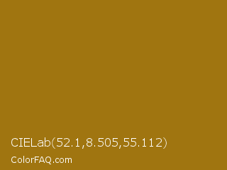 CIELab 52.1,8.505,55.112 Color is a normal orange color and the nearest color is Buttered Rum #a1750d. Hex code #a07510 and RGB value is rgb(160,117,16). In RGB color space, this color is composed of 63% red, 46% green, 6% blue, In CMYK color space, this color is composed of 0% cyan, 27% magenta, 90% yellow , 37% black , In HSL color space, this color has a hue angle of 42° , 82% saturation and 35% lightness.