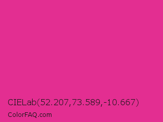 CIELab 52.207,73.589,-10.667 Color is a normal magenta color and the nearest color is Cerise #da3287. Hex code #e32e91 and RGB value is rgb(227,46,145). In RGB color space, this color is composed of 89% red, 18% green, 57% blue, In CMYK color space, this color is composed of 0% cyan, 80% magenta, 36% yellow , 11% black , In HSL color space, this color has a hue angle of 327° , 76% saturation and 54% lightness.