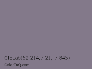 CIELab 52.214,7.21,-7.845 Color is a normal purple color and the nearest color is Mobster #7f7589. Hex code #83798a and RGB value is rgb(131,121,138). In RGB color space, this color is composed of 51% red, 47% green, 54% blue, In CMYK color space, this color is composed of 5% cyan, 12% magenta, 0% yellow , 46% black , In HSL color space, this color has a hue angle of 275° , 7% saturation and 51% lightness.