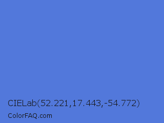 CIELab 52.221,17.443,-54.772 Color is a normal blue color and the nearest color is Han Blue #446ccf. Hex code #5278db and RGB value is rgb(82,120,219). In RGB color space, this color is composed of 32% red, 47% green, 86% blue, In CMYK color space, this color is composed of 63% cyan, 45% magenta, 0% yellow , 14% black , In HSL color space, this color has a hue angle of 223° , 66% saturation and 59% lightness.