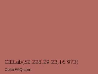 CIELab 52.228,29.23,16.973 Color is a normal red color and the nearest color is Copper Penny #ad6f69. Hex code #b36861 and RGB value is rgb(179,104,97). In RGB color space, this color is composed of 70% red, 41% green, 38% blue, In CMYK color space, this color is composed of 0% cyan, 42% magenta, 46% yellow , 30% black , In HSL color space, this color has a hue angle of 5° , 35% saturation and 54% lightness.