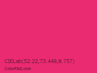 CIELab 52.22,73.449,8.757 Color is a normal rose color and the nearest color is Razzmatazz #e3256b. Hex code #ea2a71 and RGB value is rgb(234,42,113). In RGB color space, this color is composed of 92% red, 16% green, 44% blue, In CMYK color space, this color is composed of 0% cyan, 82% magenta, 52% yellow , 8% black , In HSL color space, this color has a hue angle of 338° , 82% saturation and 54% lightness.