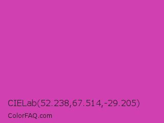 CIELab 52.238,67.514,-29.205 Color is a normal magenta color and the nearest color is Byzantine #bd33a4. Hex code #d140b0 and RGB value is rgb(209,64,176). In RGB color space, this color is composed of 82% red, 25% green, 69% blue, In CMYK color space, this color is composed of 0% cyan, 69% magenta, 16% yellow , 18% black , In HSL color space, this color has a hue angle of 314° , 61% saturation and 54% lightness.