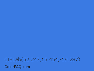 CIELab 52.247,15.454,-59.287 Color is a normal blue color and the nearest color is Royal Blue #4169e1. Hex code #3a7ae3 and RGB value is rgb(58,122,227). In RGB color space, this color is composed of 23% red, 48% green, 89% blue, In CMYK color space, this color is composed of 74% cyan, 46% magenta, 0% yellow , 11% black , In HSL color space, this color has a hue angle of 217° , 75% saturation and 56% lightness.