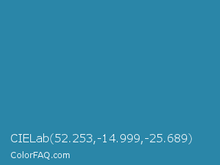 CIELab 52.253,-14.999,-25.689 Color is a normal blue color and the nearest color is Astral #327da0. Hex code #2a86a8 and RGB value is rgb(42,134,168). In RGB color space, this color is composed of 16% red, 53% green, 66% blue, In CMYK color space, this color is composed of 75% cyan, 20% magenta, 0% yellow , 34% black , In HSL color space, this color has a hue angle of 196° , 60% saturation and 41% lightness.