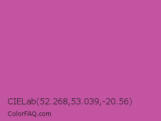 CIELab 52.268,53.039,-20.56 Color is a normal magenta color and the nearest color is Pearly Purple #b768a2. Hex code #c254a1 and RGB value is rgb(194,84,161). In RGB color space, this color is composed of 76% red, 33% green, 63% blue, In CMYK color space, this color is composed of 0% cyan, 57% magenta, 17% yellow , 24% black , In HSL color space, this color has a hue angle of 318° , 47% saturation and 55% lightness.