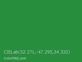 CIELab 52.271,-47.295,34.332 Color is a normal green color and the nearest color is Sea Green #2e8b57. Hex code #258f3e and RGB value is rgb(37,143,62). In RGB color space, this color is composed of 15% red, 56% green, 24% blue, In CMYK color space, this color is composed of 74% cyan, 0% magenta, 57% yellow , 44% black , In HSL color space, this color has a hue angle of 134° , 59% saturation and 35% lightness.