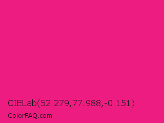 CIELab 52.279,77.988,-0.151 Color is a normal rose color and the nearest color is Barbie Pink #e0218a. Hex code #ed1c80 and RGB value is rgb(237,28,128). In RGB color space, this color is composed of 93% red, 11% green, 50% blue, In CMYK color space, this color is composed of 0% cyan, 88% magenta, 46% yellow , 7% black , In HSL color space, this color has a hue angle of 331° , 85% saturation and 52% lightness.