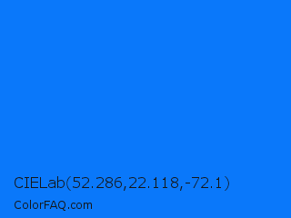CIELab 52.286,22.118,-72.1 Color is a normal blue color and the nearest color is Azure Radiance #007fff. Hex code #0a78fa and RGB value is rgb(10,120,250). In RGB color space, this color is composed of 4% red, 47% green, 98% blue, In CMYK color space, this color is composed of 96% cyan, 52% magenta, 0% yellow , 2% black , In HSL color space, this color has a hue angle of 213° , 96% saturation and 51% lightness.