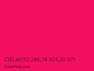 CIELab 52.288,78.924,20.07 Color is a normal rose color and the nearest color is Raspberry #e30b5d. Hex code #f40f5f and RGB value is rgb(244,15,95). In RGB color space, this color is composed of 96% red, 6% green, 37% blue, In CMYK color space, this color is composed of 0% cyan, 94% magenta, 61% yellow , 4% black , In HSL color space, this color has a hue angle of 339° , 91% saturation and 51% lightness.