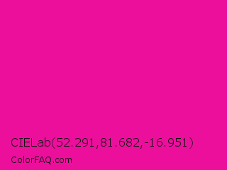 CIELab 52.291,81.682,-16.951 Color is a normal magenta color and the nearest color is Hollywood Cerise #f400a1. Hex code #eb0f9c and RGB value is rgb(235,15,156). In RGB color space, this color is composed of 92% red, 6% green, 61% blue, In CMYK color space, this color is composed of 0% cyan, 94% magenta, 34% yellow , 8% black , In HSL color space, this color has a hue angle of 322° , 88% saturation and 49% lightness.