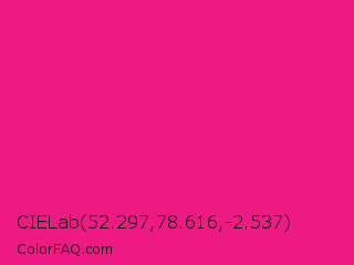 CIELab 52.297,78.616,-2.537 Color is a normal rose color and the nearest color is Barbie Pink #e0218a. Hex code #ed1a84 and RGB value is rgb(237,26,132). In RGB color space, this color is composed of 93% red, 10% green, 52% blue, In CMYK color space, this color is composed of 0% cyan, 89% magenta, 44% yellow , 7% black , In HSL color space, this color has a hue angle of 330° , 85% saturation and 52% lightness.