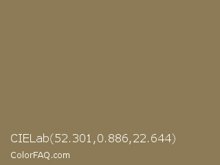 CIELab 52.301,0.886,22.644 Color is a normal orange color and the nearest color is Shadow #8a795d. Hex code #8c7b56 and RGB value is rgb(140,123,86). In RGB color space, this color is composed of 55% red, 48% green, 34% blue, In CMYK color space, this color is composed of 0% cyan, 12% magenta, 39% yellow , 45% black , In HSL color space, this color has a hue angle of 41° , 24% saturation and 44% lightness.