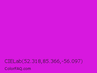 CIELab 52.318,85.366,-56.097 Color is a normal magenta color and the nearest color is Deep Magenta #cc00cc. Hex code #d718df and RGB value is rgb(215,24,223). In RGB color space, this color is composed of 84% red, 9% green, 87% blue, In CMYK color space, this color is composed of 4% cyan, 89% magenta, 0% yellow , 13% black , In HSL color space, this color has a hue angle of 298° , 81% saturation and 48% lightness.