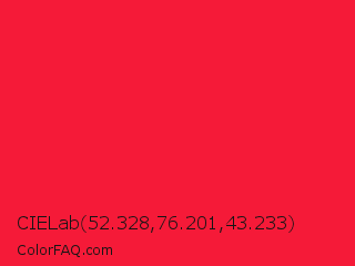 CIELab 52.328,76.201,43.233 Color is a normal red color and the nearest color is Torch Red #fd0e35. Hex code #f51a38 and RGB value is rgb(245,26,56). In RGB color space, this color is composed of 96% red, 10% green, 22% blue, In CMYK color space, this color is composed of 0% cyan, 89% magenta, 77% yellow , 4% black , In HSL color space, this color has a hue angle of 352° , 92% saturation and 53% lightness.