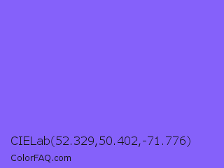 CIELab 52.329,50.402,-71.776 Color is a light indigo color and the nearest color is Medium Slate Blue #7b68ee. Hex code #8561fa and RGB value is rgb(133,97,250). In RGB color space, this color is composed of 52% red, 38% green, 98% blue, In CMYK color space, this color is composed of 47% cyan, 61% magenta, 0% yellow , 2% black , In HSL color space, this color has a hue angle of 254° , 94% saturation and 68% lightness.