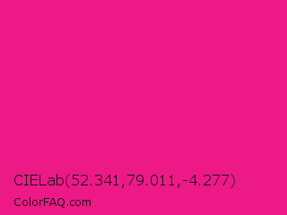CIELab 52.341,79.011,-4.277 Color is a normal rose color and the nearest color is Barbie Pink #e0218a. Hex code #ed1987 and RGB value is rgb(237,25,135). In RGB color space, this color is composed of 93% red, 10% green, 53% blue, In CMYK color space, this color is composed of 0% cyan, 89% magenta, 43% yellow , 7% black , In HSL color space, this color has a hue angle of 329° , 85% saturation and 51% lightness.