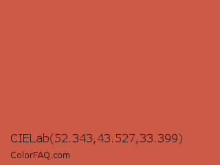 CIELab 52.343,43.527,33.399 Color is a normal red color and the nearest color is Dark Coral #cd5b45. Hex code #cb5a46 and RGB value is rgb(203,90,70). In RGB color space, this color is composed of 80% red, 35% green, 27% blue, In CMYK color space, this color is composed of 0% cyan, 56% magenta, 66% yellow , 20% black , In HSL color space, this color has a hue angle of 9° , 56% saturation and 54% lightness.