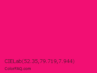 CIELab 52.35,79.719,7.944 Color is a normal rose color and the nearest color is Vivid Raspberry #ff006c. Hex code #f20f73 and RGB value is rgb(242,15,115). In RGB color space, this color is composed of 95% red, 6% green, 45% blue, In CMYK color space, this color is composed of 0% cyan, 94% magenta, 52% yellow , 5% black , In HSL color space, this color has a hue angle of 334° , 90% saturation and 50% lightness.