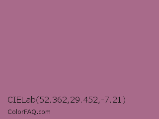 CIELab 52.362,29.452,-7.21 Color is a normal rose color and the nearest color is Tapestry #b05e81. Hex code #a86a8a and RGB value is rgb(168,106,138). In RGB color space, this color is composed of 66% red, 42% green, 54% blue, In CMYK color space, this color is composed of 0% cyan, 37% magenta, 18% yellow , 34% black , In HSL color space, this color has a hue angle of 329° , 26% saturation and 54% lightness.