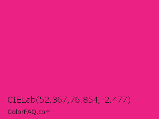 CIELab 52.367,76.854,-2.477 Color is a normal rose color and the nearest color is Barbie Pink #e0218a. Hex code #eb2284 and RGB value is rgb(235,34,132). In RGB color space, this color is composed of 92% red, 13% green, 52% blue, In CMYK color space, this color is composed of 0% cyan, 86% magenta, 44% yellow , 8% black , In HSL color space, this color has a hue angle of 331° , 83% saturation and 53% lightness.