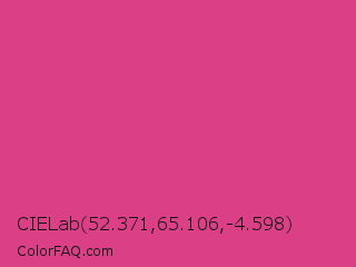 CIELab 52.371,65.106,-4.598 Color is a normal rose color and the nearest color is Cerise #da3287. Hex code #db4087 and RGB value is rgb(219,64,135). In RGB color space, this color is composed of 86% red, 25% green, 53% blue, In CMYK color space, this color is composed of 0% cyan, 71% magenta, 38% yellow , 14% black , In HSL color space, this color has a hue angle of 333° , 68% saturation and 55% lightness.