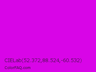 CIELab 52.372,88.524,-60.532 Color is a normal magenta color and the nearest color is Phlox #df00ff. Hex code #d805e7 and RGB value is rgb(216,5,231). In RGB color space, this color is composed of 85% red, 2% green, 91% blue, In CMYK color space, this color is composed of 6% cyan, 98% magenta, 0% yellow , 9% black , In HSL color space, this color has a hue angle of 296° , 96% saturation and 46% lightness.