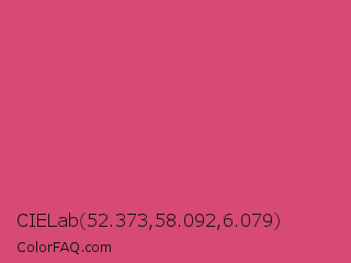CIELab 52.373,58.092,6.079 Color is a normal rose color and the nearest color is Cabaret #d94972. Hex code #d64a75 and RGB value is rgb(214,74,117). In RGB color space, this color is composed of 84% red, 29% green, 46% blue, In CMYK color space, this color is composed of 0% cyan, 65% magenta, 45% yellow , 16% black , In HSL color space, this color has a hue angle of 342° , 63% saturation and 56% lightness.