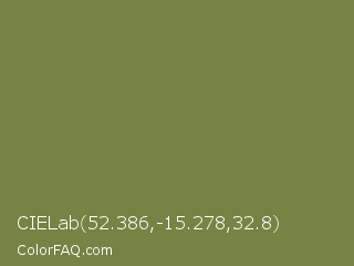 CIELab 52.386,-15.278,32.8 Color is a normal lime color and the nearest color is Old Moss Green #867e36. Hex code #768343 and RGB value is rgb(118,131,67). In RGB color space, this color is composed of 46% red, 51% green, 26% blue, In CMYK color space, this color is composed of 10% cyan, 0% magenta, 49% yellow , 49% black , In HSL color space, this color has a hue angle of 72° , 32% saturation and 39% lightness.