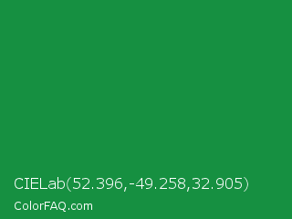 CIELab 52.396,-49.258,32.905 Color is a normal green color and the nearest color is North Texas Green #059033. Hex code #169041 and RGB value is rgb(22,144,65). In RGB color space, this color is composed of 9% red, 56% green, 25% blue, In CMYK color space, this color is composed of 85% cyan, 0% magenta, 55% yellow , 44% black , In HSL color space, this color has a hue angle of 141° , 73% saturation and 33% lightness.