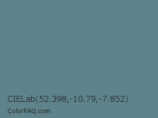 CIELab 52.398,-10.79,-7.852 Color is a normal cyan color and the nearest color is Steel Teal #5f8a8b. Hex code #5f838a and RGB value is rgb(95,131,138). In RGB color space, this color is composed of 37% red, 51% green, 54% blue, In CMYK color space, this color is composed of 31% cyan, 5% magenta, 0% yellow , 46% black , In HSL color space, this color has a hue angle of 190° , 18% saturation and 46% lightness.